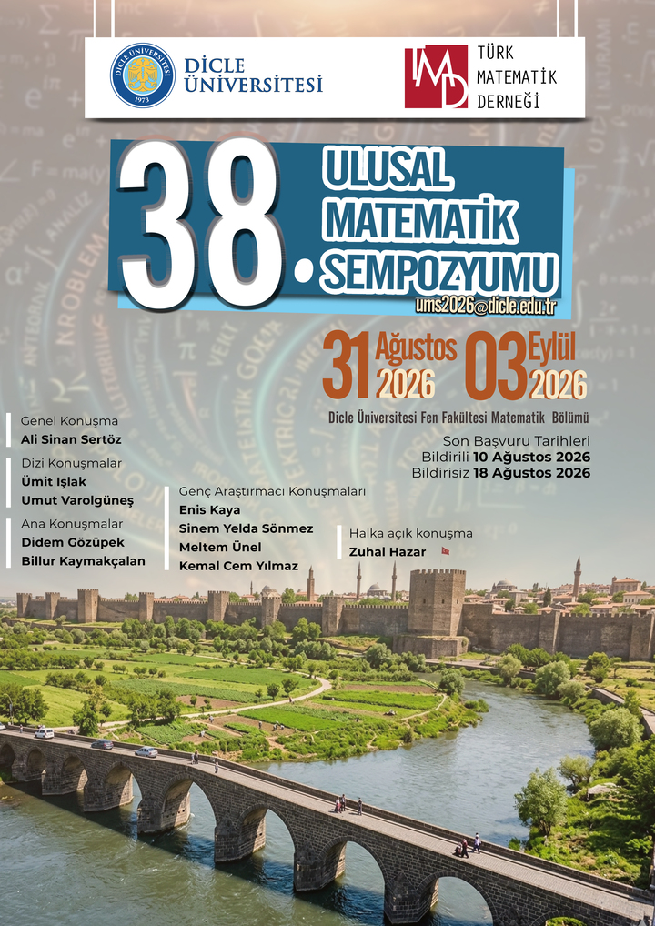 1988 yılından beri aralıksız olarak derneğimiz himayesinde düzenlenmekte olan Ulusal Matematik Sempozyumlarının 38’incisi, 31 Ağustos-3 Eylül 2026 tarihleri arasında Dicle Üniversitesi Matematik Bölümünün ev sahipliğinde Diyarbakır’da gerçekleştirilecektir.